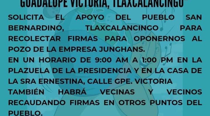 Tras la conformación del Comité de Defensa del Agua de la calle Guadalupe Victoria, donde se comenzaron las obras, vecinos recolectaron firmas para frenar las acciones de perforación de este pozo: “somos un pueblo originario y no podemos sufrir estas agresiones de construcción de un pozo profundo, seguiremos las instancias legales y acudiremos a Conagua para evitar estas acciones”, señaló una de las inconformes.